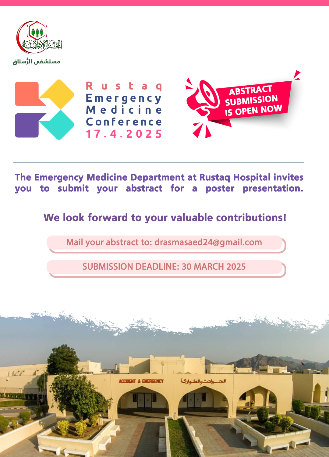 We are proud and delighted to invite you to the very first Rustaq Emergency Medicine Conference, taking place on 17th of April 2025 in the heart of Rustaq city at the Wali Office.